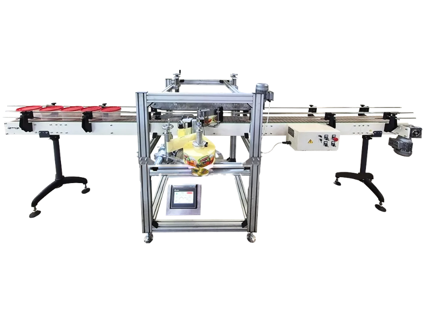 Данная этикетировочная машина оснащена верхним прижимом, благодаря которому легкая тара не сдвигается в момент нанесения этикетки.
