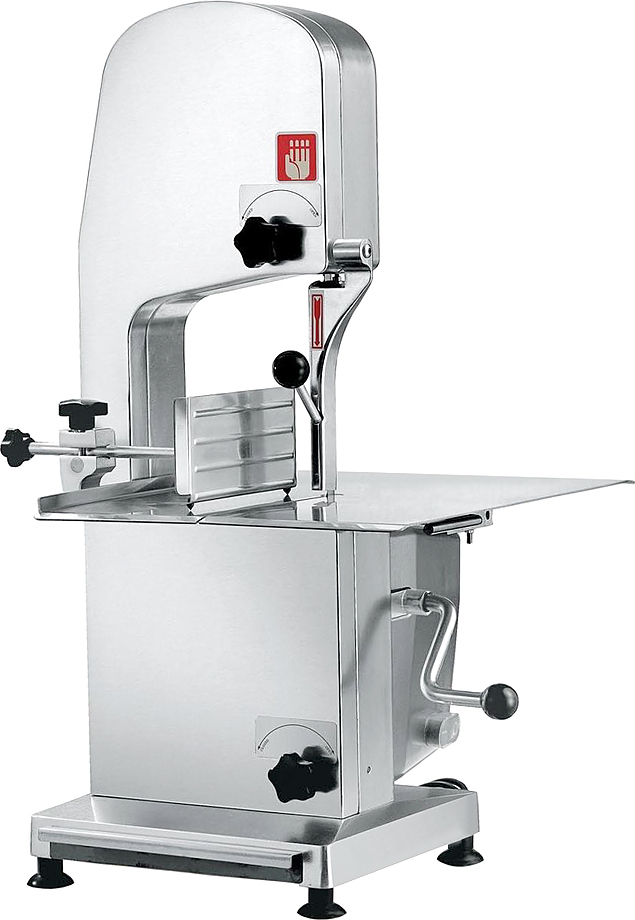 Благодаря высокой скорости вращения пильного полотна, пила выполняет аккуратный и ровный срез даже при резке продукта с костью и жилами. Есть регулировка натяжения полотна и толщины резки, механический толкатель для безопасной работы.